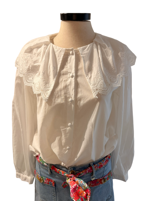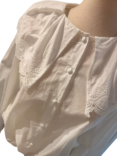 Delicada, romántica y atemporal, destaca por su hermoso cuello amplio encaje bordado y sus finos botones al frente aportando un aire femenino y elegante a cualquier look.
