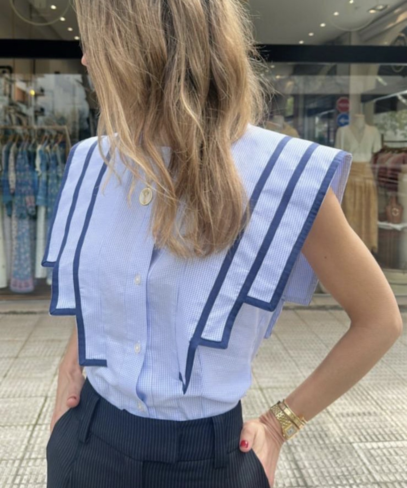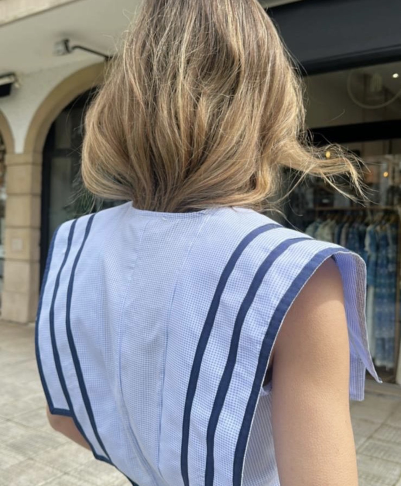 Camisa sin mangas de inspiración marinera confeccionada en algodón ligero con microcuadro en tono azul cielo.